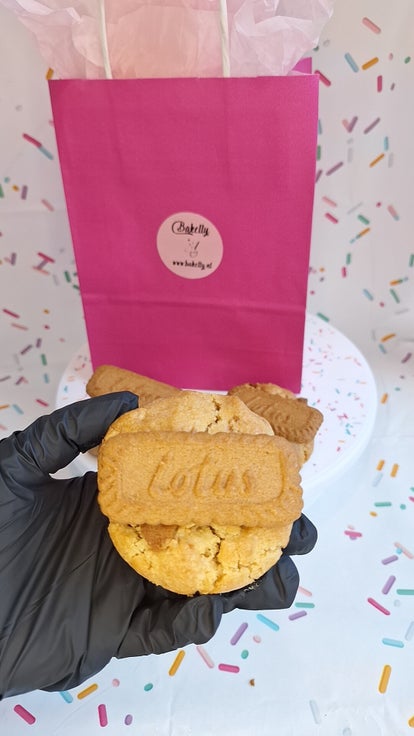 Een chocolate chip cookie met witte chocolade stukjes en gehakte biscoff koekjes. gevuld met speculoos! 🤤